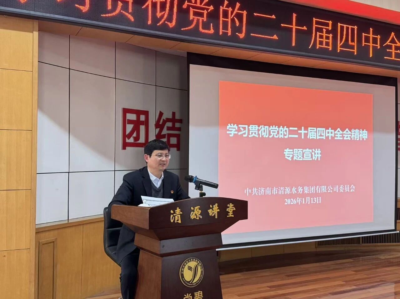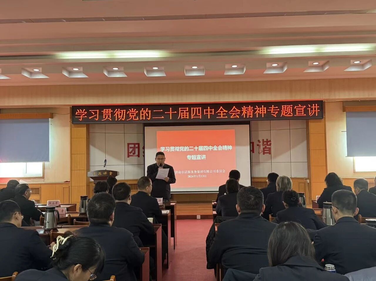 1月13日,济南市清源水务集团有限公司党委组织学习贯彻党的二十届四中全会精神专题宣讲。党委书记、董事长魏长学作宣讲报告,党委副书记、董事、总经理金强主持会议,集团公司领导、各职能部室主要负责人及各党支部书记、支委成员、党员、入党积极分子、群众、统战对象代表参加学习。